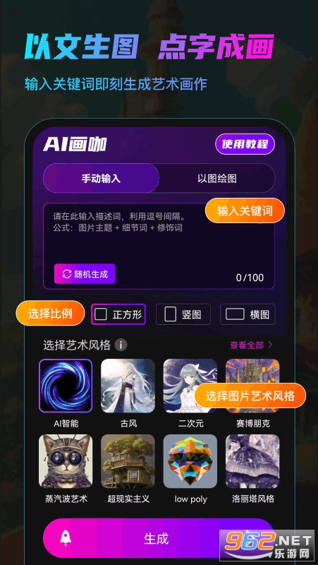 《AI画咖app》是三河市二由网络科技有限公司推出的一款AI智能绘图软件,进入软件之后朋友们可以看到手动输入和以图绘图两个选项,可以选择正方形、竖图等各种不同的比例,有着古风、二次元、赛博朋克等各种风格可以自由选择,一键生成精美图片。