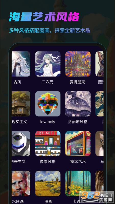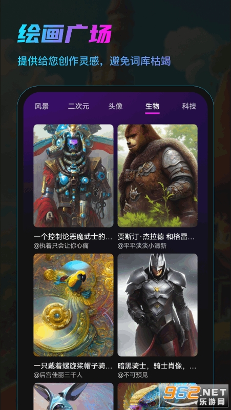 AI画咖在广场页面提供了大量的高质量画作,种类多多,特征鲜明,查看画作的关键词即可收获同款灵感,用于自己的创作,更有丰富的艺术风格供你选择,从油画到水彩,从二次元到古风,选择喜欢的风格,快速提高画作的质量与完整性。