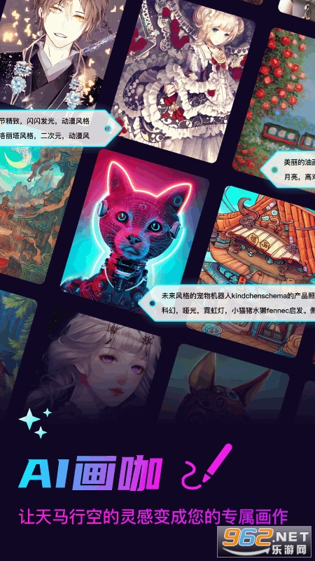简单描述一下你的想法,例如““在薰衣草中漫步的公主”、“白雪皑皑的高山”、“由新海诚绘画的一条美人鱼”或任何你能想像到的,选择你想要的风格,点击 “生成” 并等待十几秒钟,就能看到自己创造的专属作品。AI画咖使用前沿的AI模型来生成AI绘画作品。画出自己的梦境,可生成古诗词,歌曲,文章,小说,电影配图等等,也可以制作独一无二的手机壁纸,更多玩法用途等你来探索~
