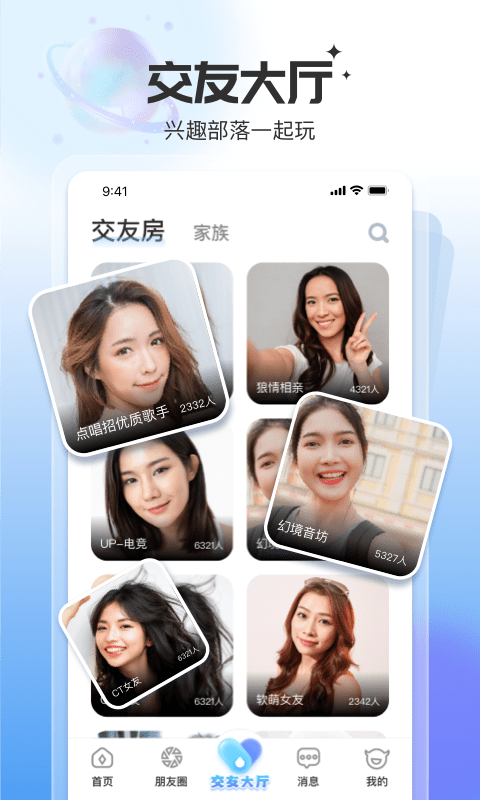1、交友大厅:房间内可进行相亲、K歌、闲聊等多种活动,家族频道支持语音互动,氛围轻松愉快