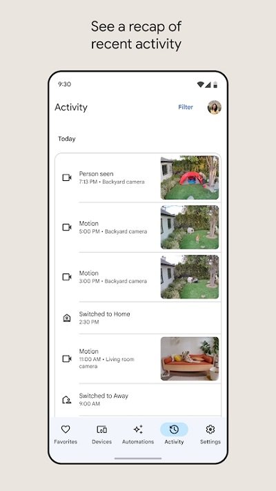 家中动静一目了然。Google Home 应用经过精心设计,可向您展示家居状态,并让您及时了解错过的事项。