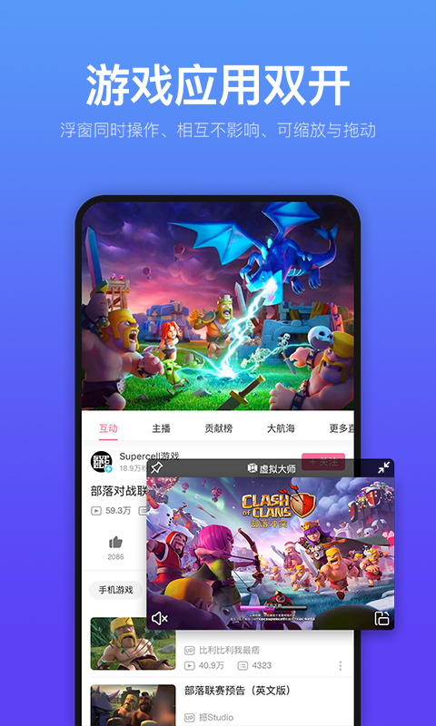 3、支持真机和虚拟机双开同屏操作。游戏双开,双开,边玩游戏边看直播,边玩游戏边聊天,比云手机更流畅,工作生活两不误。