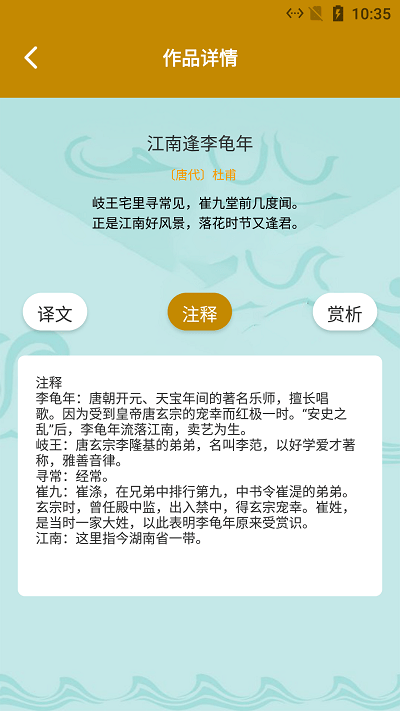 2、详情查看:详情页内容详尽,支持同步查看注解,译文和赏析;