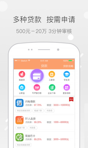 1、极速贷款:整合50家贷款口子在线申请,当天审核,24小时内快速放款 。