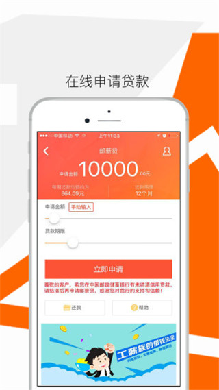 邮e贷app是中国邮政储蓄银行推出的专属网络信贷app,致力于通过互联网金融+”的商业模式和技术创新,为广大客户提供更便捷的在线金融服务。为用户提供不超过100万元的年信用贷款服务,用户可在线申请,银行快速审核信用,综合评估,快速放款,解决用户资金需求。