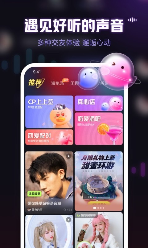 鱼耳是一款手机聊天社交app,该应用主打年轻,让年轻人一用就喜欢,让你用声音谈心、交友,还能玩K歌,更有明星歌手入驻,让你语音嗨聊。可以选择你感兴趣的小姐姐或者小哥哥与TA聊天。还能直接加入鱼耳app的各种聊天室开始聊天!