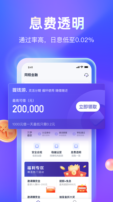 同程金融由广州市萤火虫小额贷款有限责任公司基于移动端推出的一款金融服务软件!在同程金融安卓版里,提升金融服务效率,降低金融服务成本,为有融资需求的用户提供安全、稳定、高效、便捷的消费信贷金融服务!