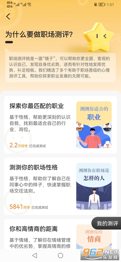 专为大学毕业的朋友们打造的找工作的软件,是前程无忧的学生版本,有着职场测评、职场体验。职场百科等众多实用的功能可以使用,还有着大量的面试题笔试题可以训练,有需要的朋友可以下载试试。