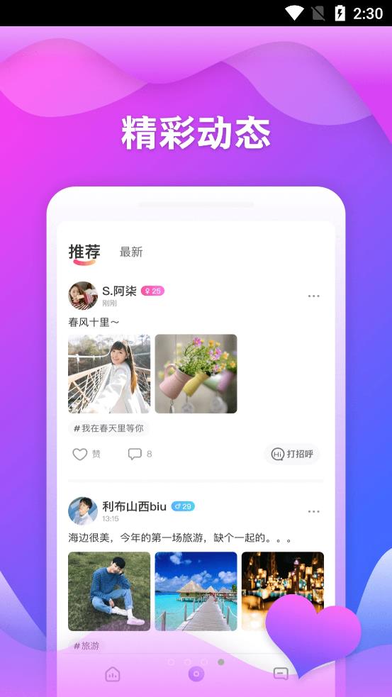 在这里随时可以进行聊天互动,点击对方的头像即可查询社区生活状态,操作起来十分的方便,同时用户可以分享自己的日常生活,来吸引更多的异性前来评论关注,让你能够认识更多的朋友,帮助你快速的进行脱单,快来下载吧。