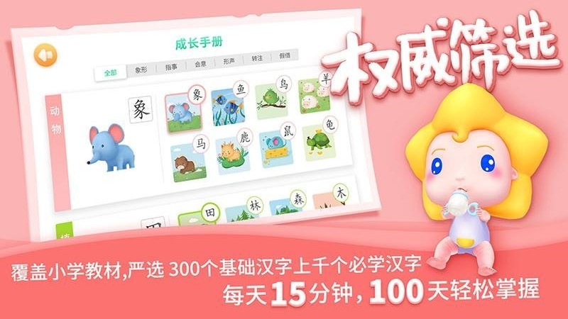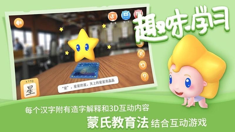 首款陪伴成长式识字产品,通过完成识字任务,既提升孩子的认知能力,也可以增加陪伴伙伴的交互内容,为更多宝宝提供轻松有趣的识字启蒙学习,app内容丰富趣味多多,以互动游戏的方式让汉字更加深入人心,快来试试吧!