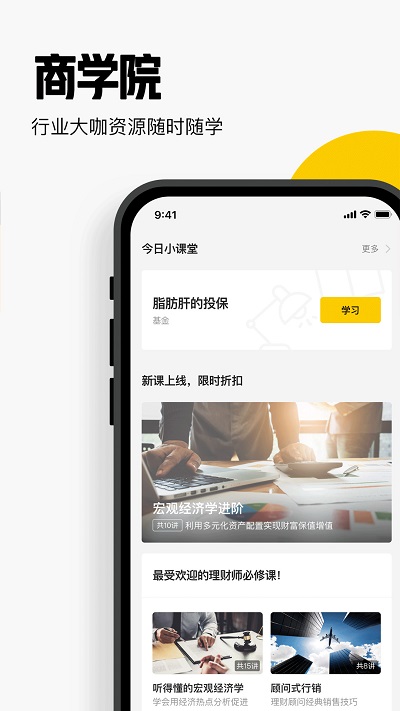 系列课程:专业知识、销售能力、素质修养、沟通表达、工作方法、从业证书、团队管理、心态建设八大模块全面培养理财师。