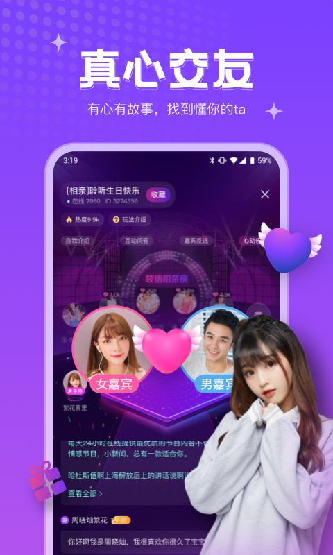 3、在吱语语音的世界里,大家可以互相匹配心仪的另一半,很快速。