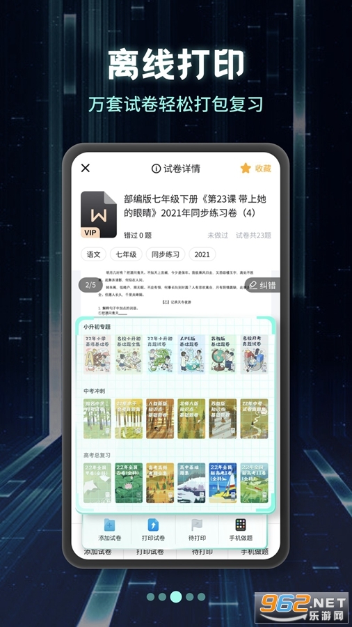 汇编小学、初中、高中同步练习试卷,针对不同学段定制考霸专属试卷文件夹以及全科目教材合集辅助资料,软件内提供优质试卷及答案解析,更支持线上刷题,线下打印,多种刷题模式满足任何场景需求,让刷题不仅局限于手掌之中,一起来疯狂刷题吧!