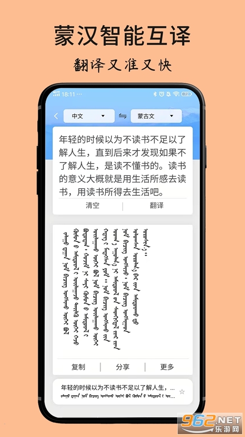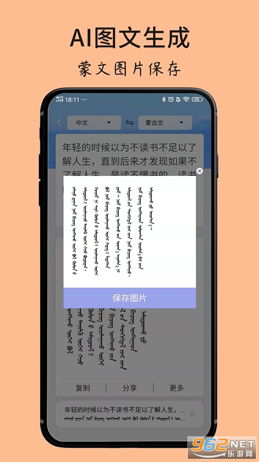 1、蒙汉智能翻译:蒙古语和汉语互译,翻译内容可以图片的形式分享保存