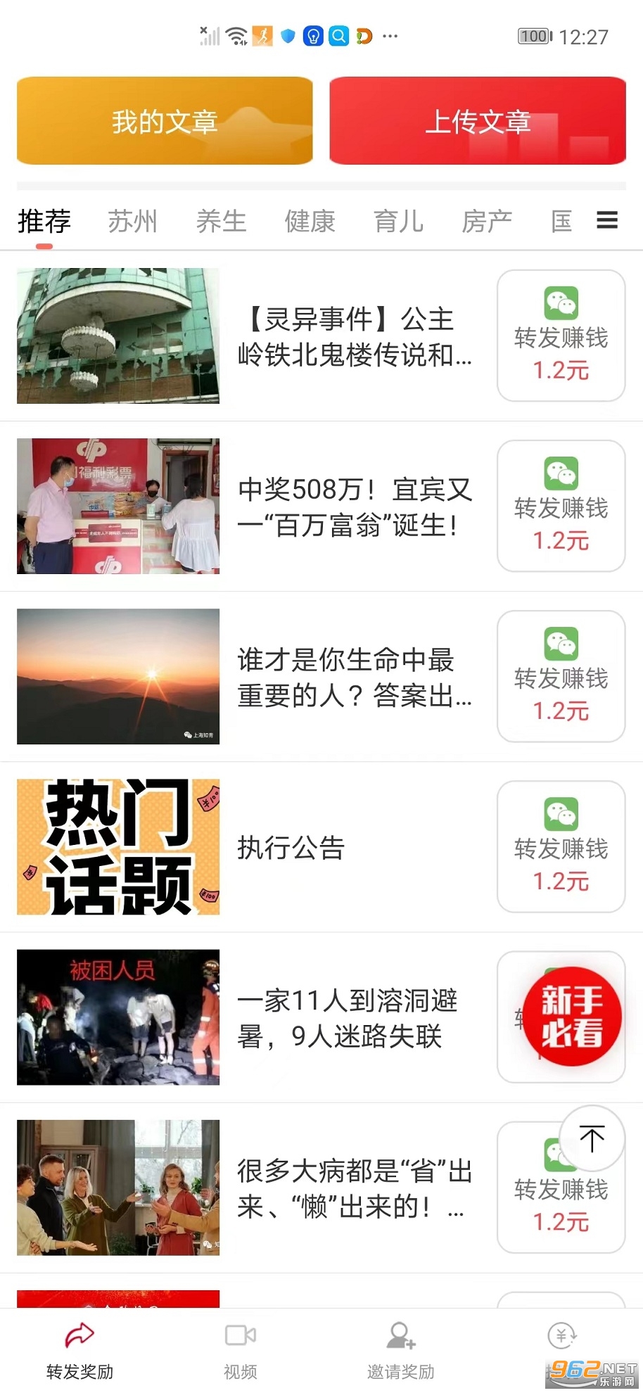 2、软件上提供了新闻、搞笑、美食、健康等文章资讯,转发至,好友点击阅读就挣钱;