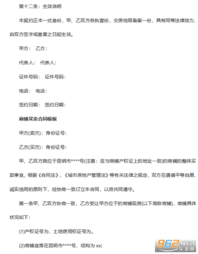 甲、乙双方就位于昆明市号(注意:应与商铺产权证上的地址一致)的商铺的整体买卖事宜,根据《合同法》、《城市房地产管理法》等有关法律之规定,双方在遵循平等自愿、诚实信用的原则下,经协商一致订立本合同,以资共同遵守。