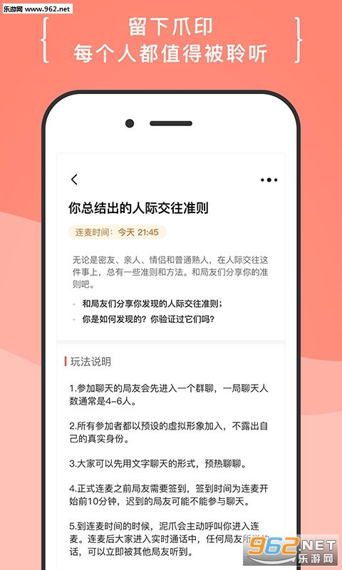 陌生人主题连麦局,化装舞会聊完即散,无压力,无尬聊。这是一个主题式的语音群聊APP,在这里你会认识各种各样有趣的伙伴。大家因为共同的兴趣而结识,分享、共情、倾诉、聆听。大家彼此分享人生经历,交换不一样的人生。