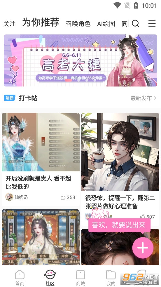 4、切换到社区,这里有众多你感兴趣的话题,例如ai绘图、声控、绘画、动漫等。