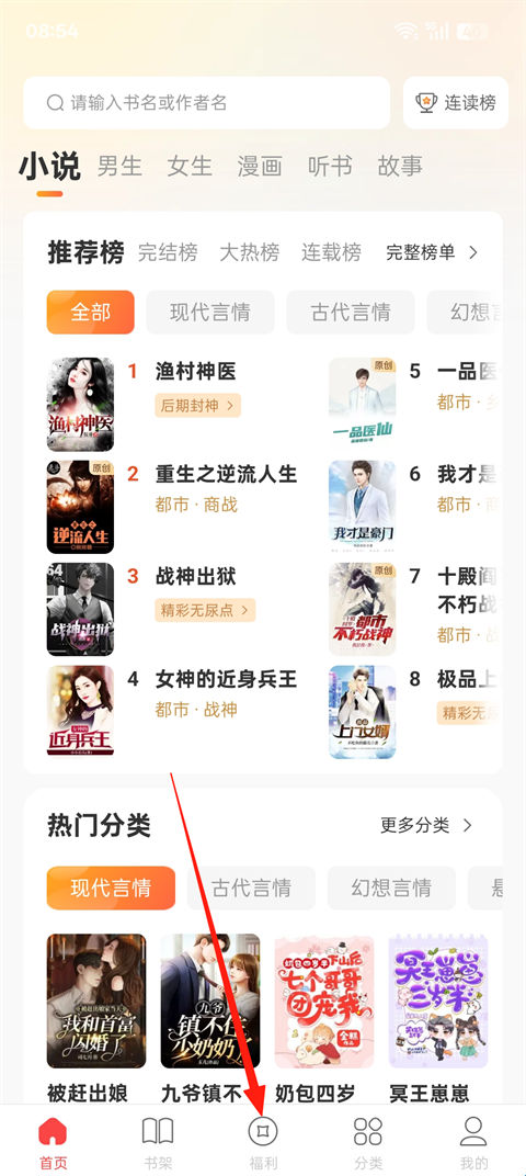 1、打开连尚读书极速版,登录之后,点击【福利】