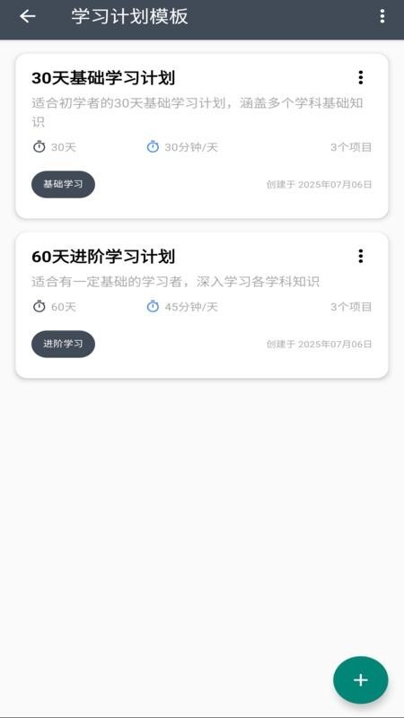 2、学习计划模版:选择需要的学习计划模版就可制定自己的学习计划,方便用户按照计划来学习打卡。