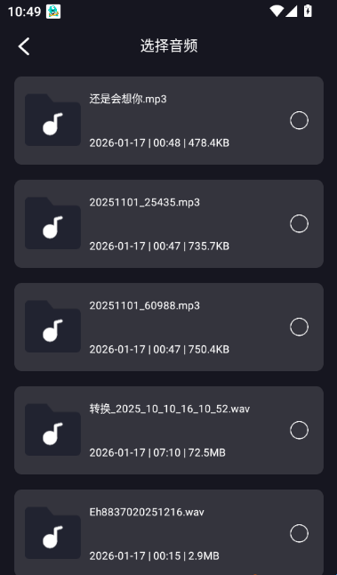 3、然后在“选择音频”菜单界面,选择需要转换音频文件点击进入