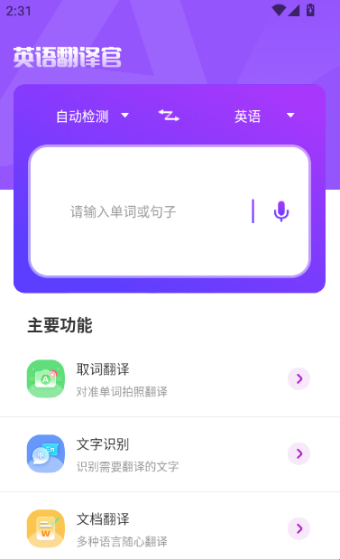 英语翻译官支持离线翻译,这样即使在网络状态不好的环境下也可以进行翻译,您还可以拍照翻译,可以翻译出几十种文字出来,直接复制粘贴使用。同声传译的翻译效果非常好,词义表达准确促成不少商业合作,需要考试的用户也可以使用这个软件来备考,还可以收藏各种陌生词汇,加强记忆,用户能够直接语言转化成翻译文字,适合各种人群。