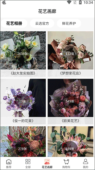 1、首先,打开软件,在花艺画廊可以选择自己喜欢的鲜花浏览;