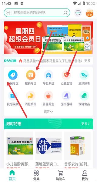 1、进入APP用搜索栏找采购品种点医保专区和控销专区等分类筛药品,逛限时特惠区选优惠药品快速找所需医药商品。