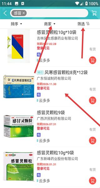 3、搜索结果页用排序商家以及筛选细化条件,查看感冒灵颗粒等药品的规格厂家库存选合适商品。