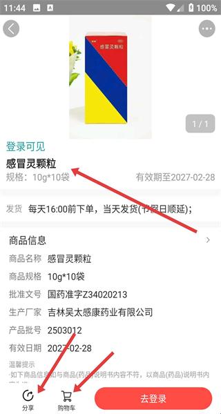 4、进入药品详情页看感冒灵颗粒规格有效期等点分享给他人,购物车暂存商品去登录后完成购买流程。