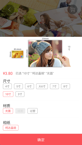 2、这上面会显示价格,选择尺寸、材质等,点击确定。