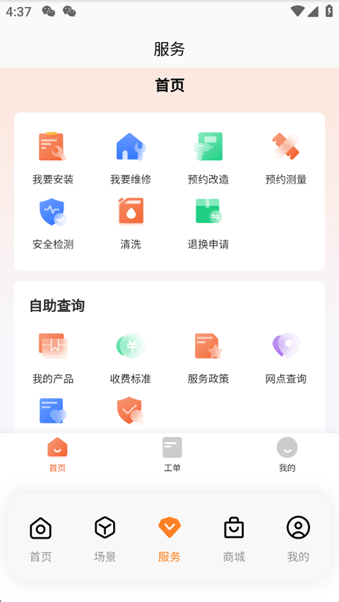 4、便捷服务:增设独立的服务板块,连接售前售后,提供在线报装、报修及自助查询等多场景服务能力,便捷触达。