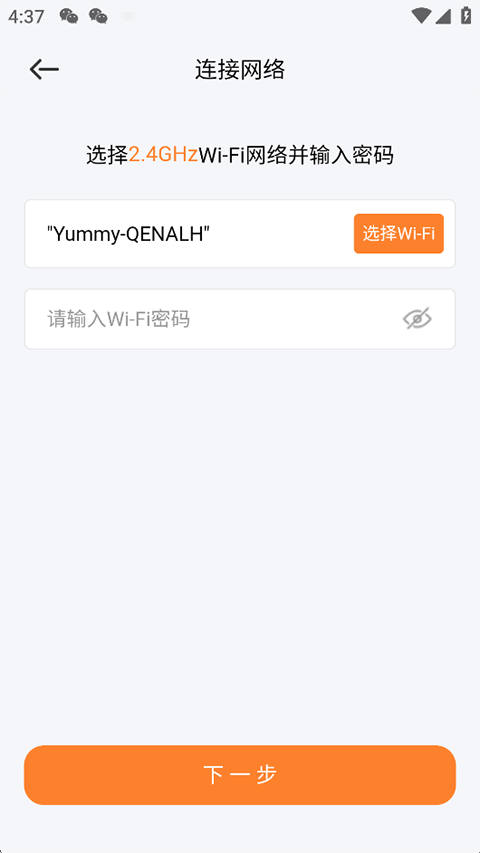 6、输入同网段的WiFi密码,接着点击下方的下一步等待连接;