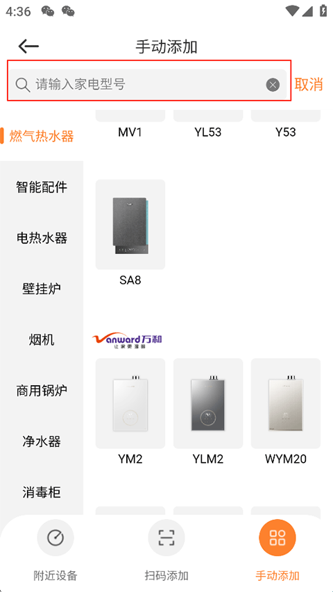 4、手动添加:在搜索框输入或是在下方筛选找到您所拥有的家电型号;