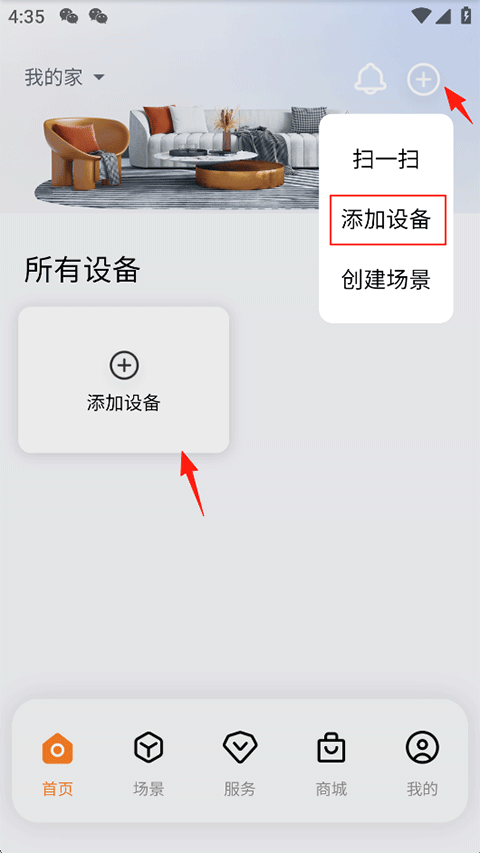 1、打开万和智能官方版App,点击首页-右上角添加-添加设备;
