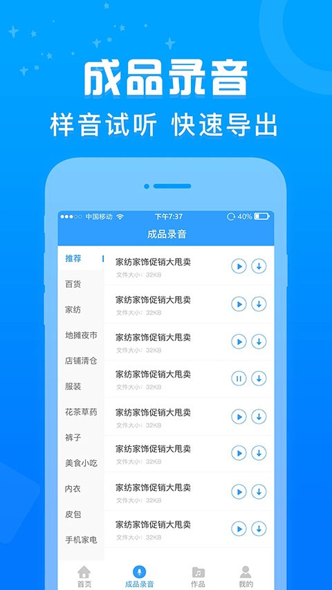 1、广告配音:商场广告促销、地摊叫卖、企业宣传、影视配音等。