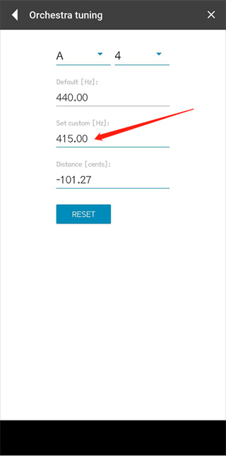 点击主界面左下角小三角形进入设置;开启Orchestra tuning”选项;点击Set custom {Hz}”旁的440.00,修改为415.00或其他所需频率;返回主界面;重复上述调音步骤即可。