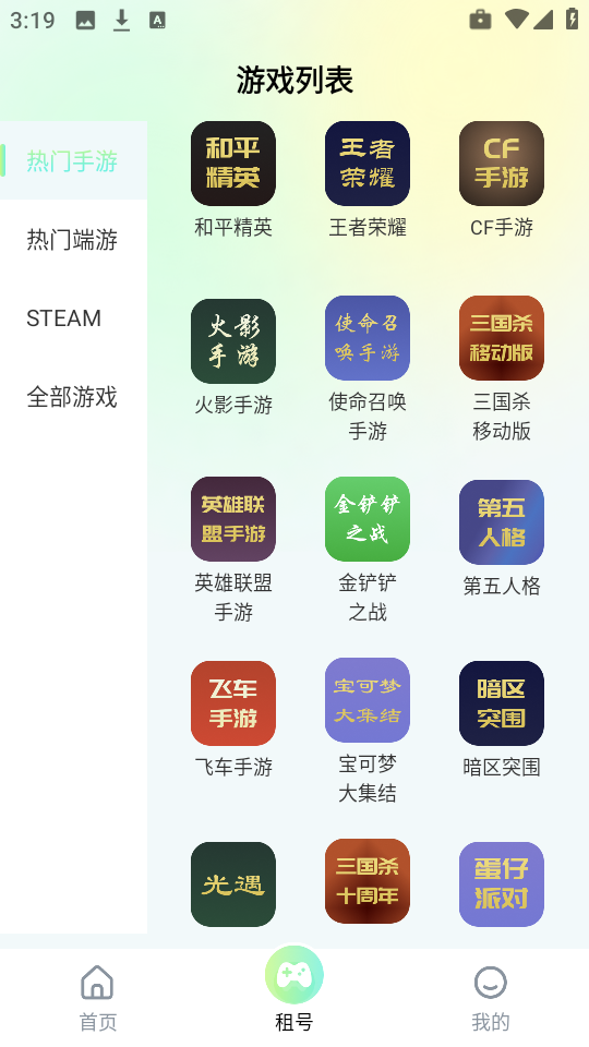 2、进入首页后,点击底部菜单栏中的租号”选项,如图所示。