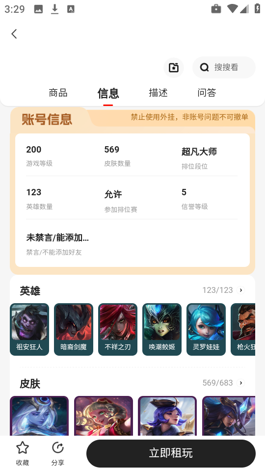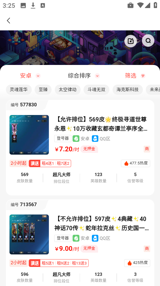1、超值优惠,优质账号低至0.2元起租,用不到一元的价格即可体验顶级装备和皮肤。