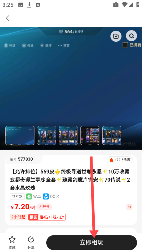 4、选定心仪的账号后,点击立即租玩”按钮完成下单。