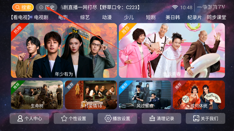 4、再次回到首页,点击上方历史