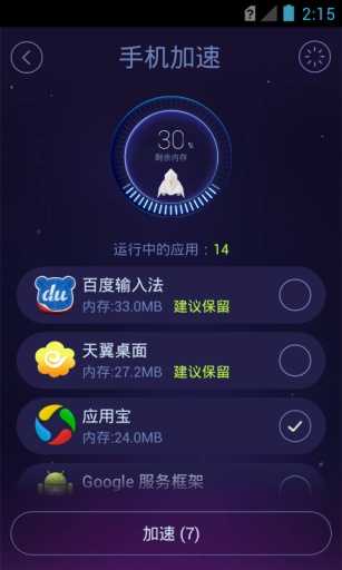 开启手机加速功能后,立即进入计算正在运行应用的所占内存界面,界面很直观的显示出手机剩余内存的百分比、正在运行应用数量与大师所建议加速应用数量,只需点击"加速"按钮,即可清理内存,提升手机运行速度。