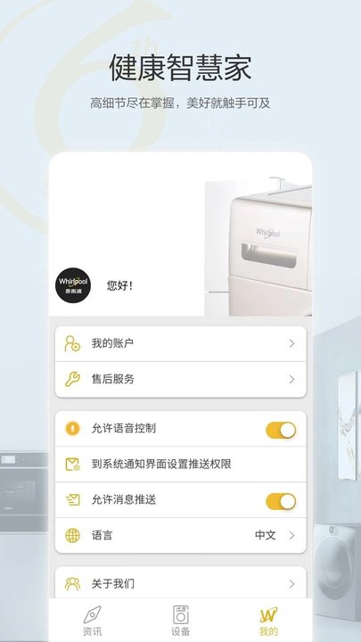 通过无线网络连接并控制具有互联网功能的机器,包括惠而浦洗衣机,惠而浦冰箱等。通过本产品您可以随时随地与家里的机器进行全方位的交互,控制机器的运转,查看机器的运行状态、收到机器的报警信息和提示信息。