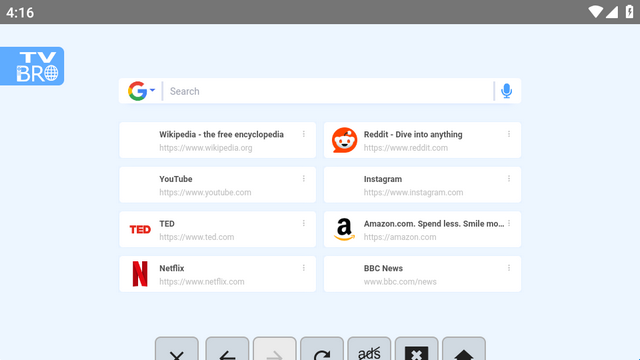 TV Bro是一款专为电视设计的简洁网页浏览器,旨在为您提供在大屏幕上的舒适浏览体验。它以其对电视遥控器的完美适应性、多标签页和书签支持等特色,让您的客厅变成一个智能的信息中心。