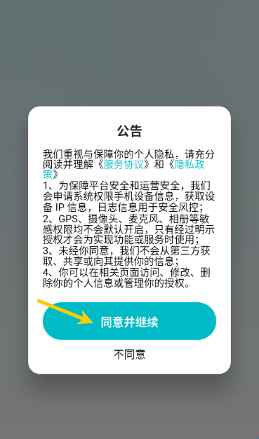 1、首先打开应用点击“同意并继续”按钮来进入app中。