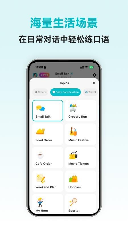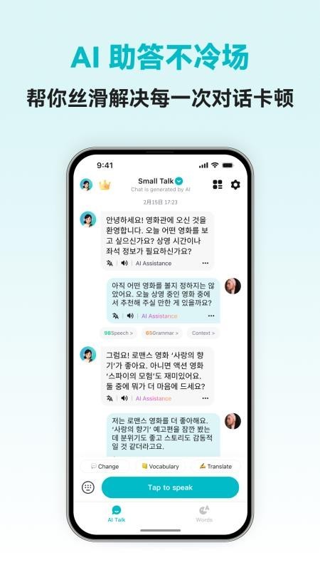 韩语智能口语APP中可以辅助大家轻松学习和锻炼自己的口语,通过AI即可进行智能对话练习,模拟不同的对话场景即可进行口语练习,快速掌握商务会话和旅行等必备的韩语对话技能,以便提升自己的对话能力,掌握正确的发音方式和技巧即可轻松进行口语提升!