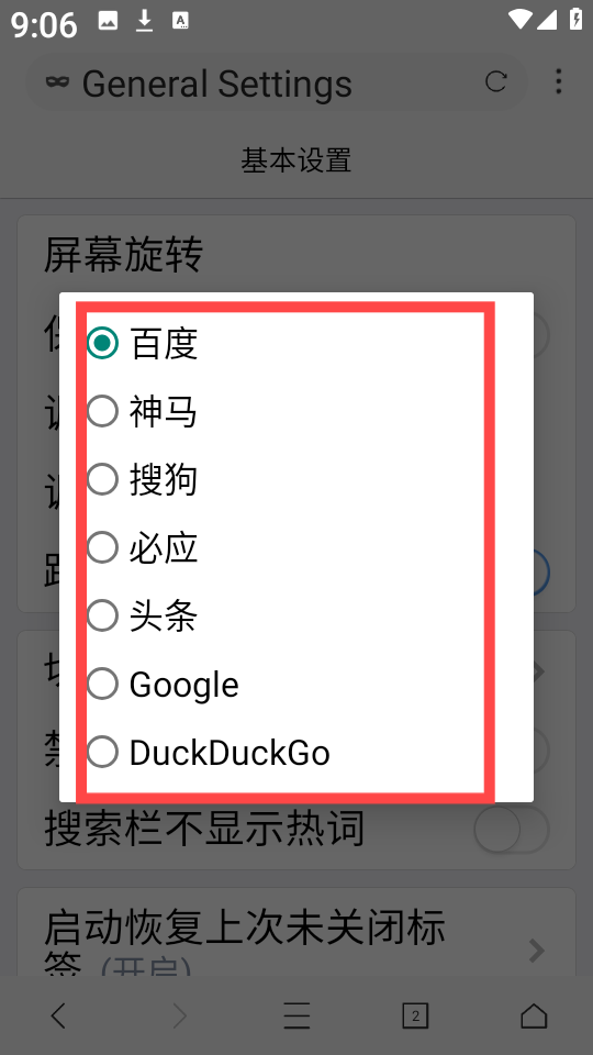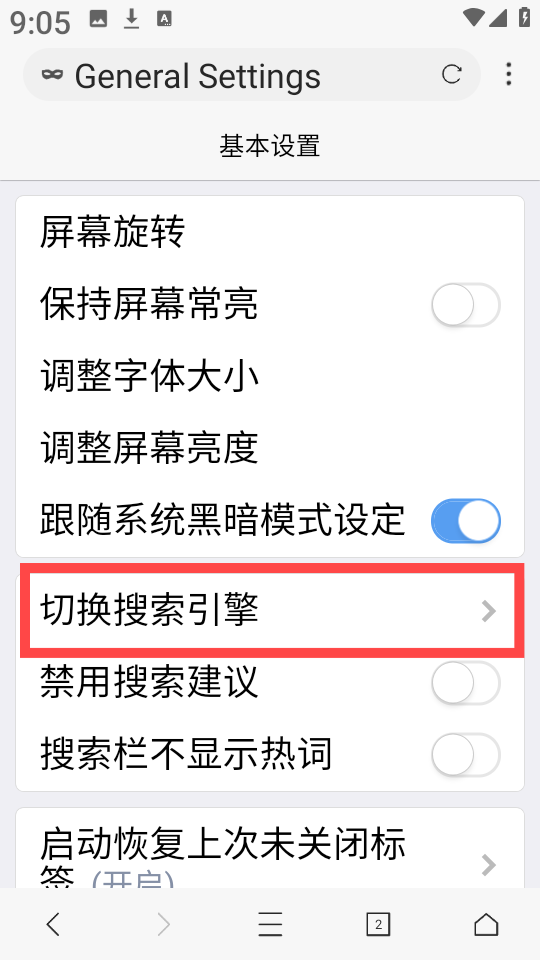 3、在基础功能中选择切换搜索引擎”,系统将展示可用的搜索服务选项。