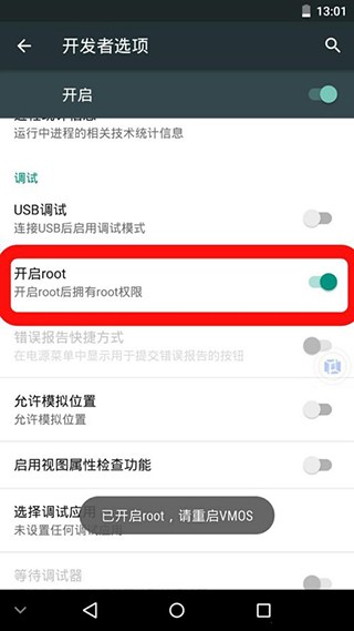 4、找到root开关,即可开启或关闭,根据提示重启VMOS。