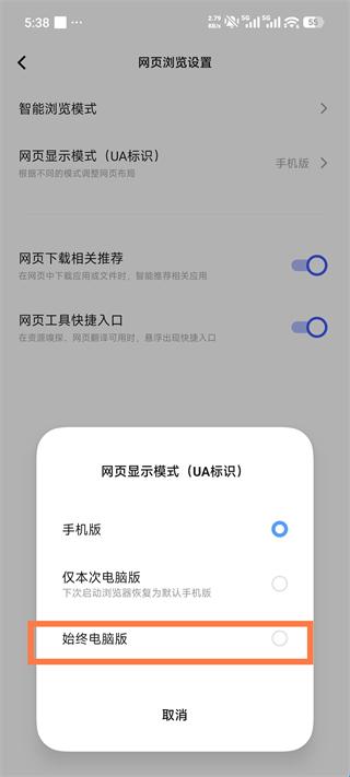 4、点击【网页显示模式】改成【电脑版即可】
