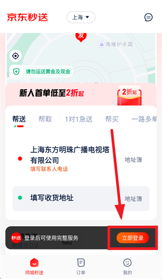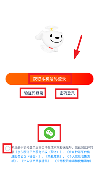 勾选未注册手机号登录后将自动生成京东秒送账号,我已阅读并同意《京东秒送平台服务协议(配送)》、《京东秒送平台信息服务协(撮合)》、《隐私政策》、《个人信息收集清单》、《个人信息共享清单》、《应用权限申请和使用清单》,从本机号码登录,验证码登录,密码登录,登录等方式中选择适合自己的方式登录即可